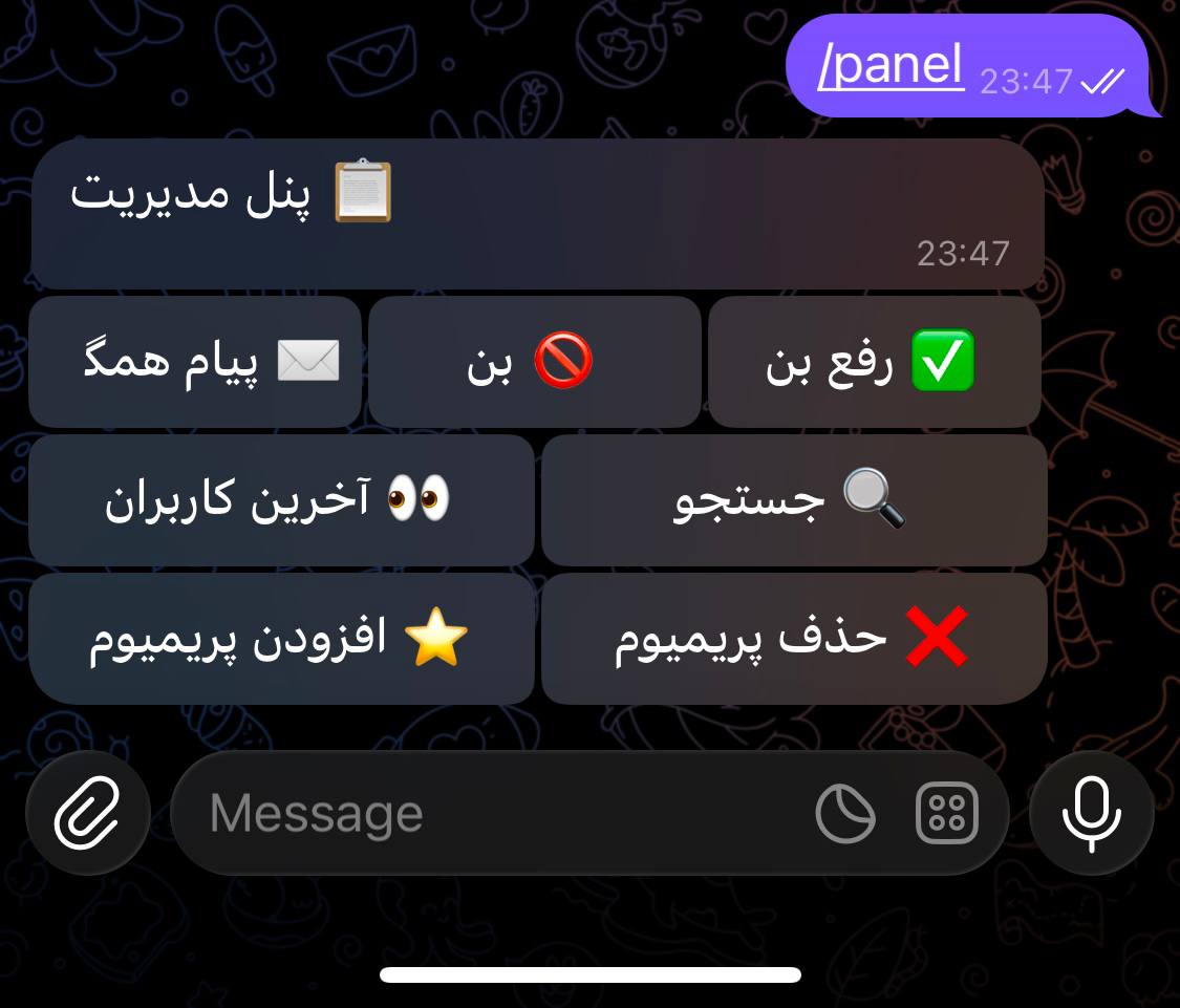 📣 پنل ادمین: ارسال پیام همگانی، بن/رفع بن، مشاهده کاربران اخیر، جستجو، اعطای/حذف پریمیوم
