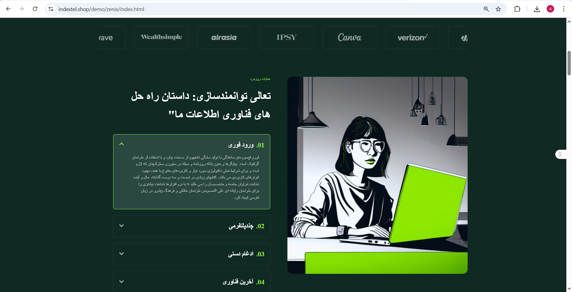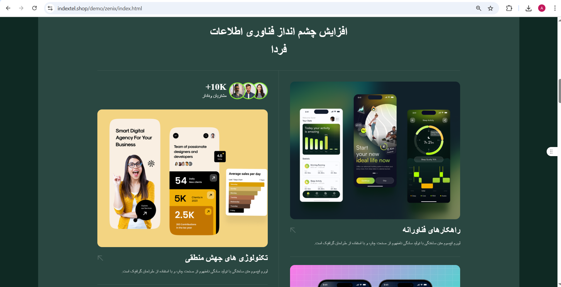 قالب IT Solutions Zeniqs یک قالب بسیار حرفهای و کارآمد است که به طراحی وبسایتهایی در زمینه خدمات فناوری اطلاعات، تکنولوژی، و راهکارهای IT بسار مناسب است. این قالب با طراحی شگفتانگیز و امکانات بینظیر خود، به شما اجازه میدهد تا وبسایتی منحصر به فرد و جذاب برای کسب و کار خود ایجاد کنید که از رقبا برجستهتر و جذابتر باشید.