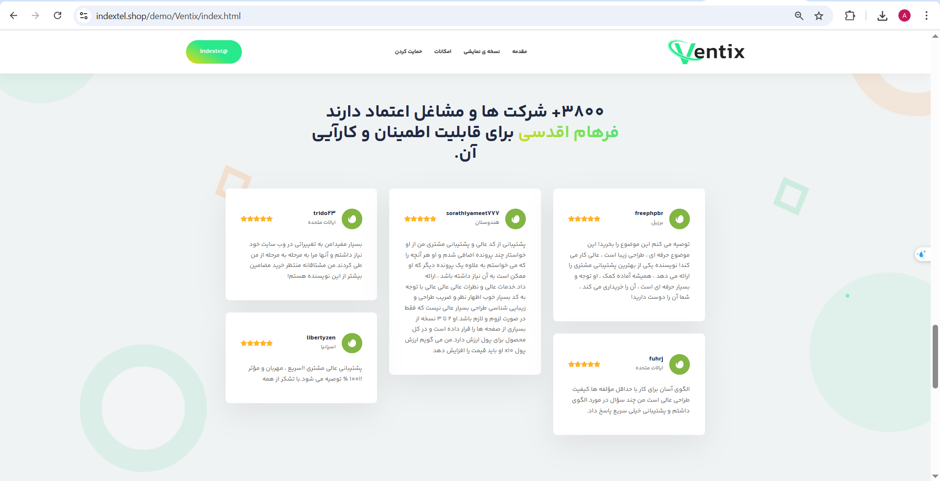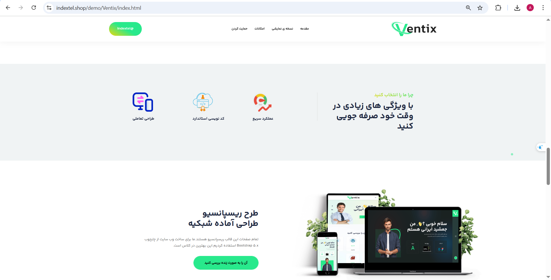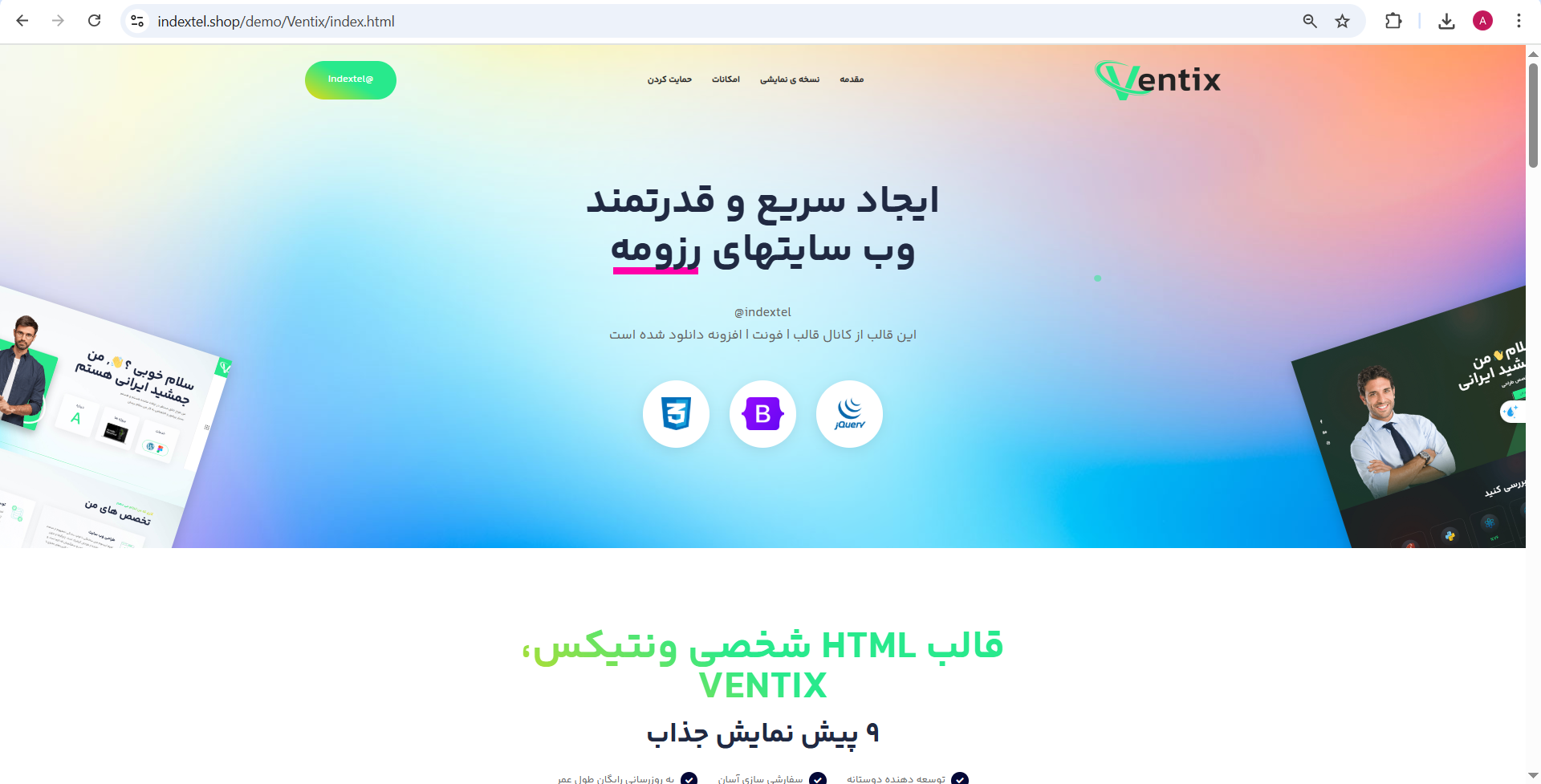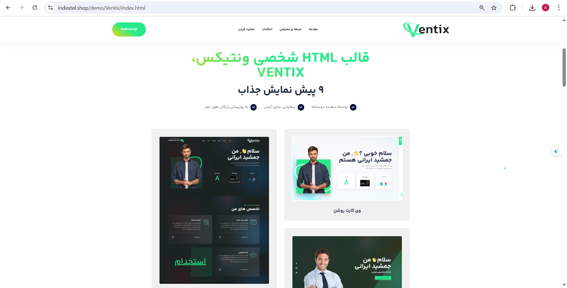 اگر به دنبال یک قالب شخصی با ظاهری زیبا برای ارائه نمونه کار و رزومه خود هستید، قالب Ventix مناسب شماست. این قالب HTML شخصی درای 9 دمو متفاوت است و میان طرح های متفاوت می توانید یکی را به دلخواه استقاده کنید. قال ونتیکس با witter Bootstrap 5x طراحی شده و کالا ریسپانسیو است و در تمامی دستگاه ها به درستی نمایش داده می شود.