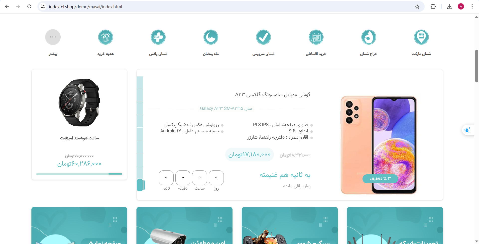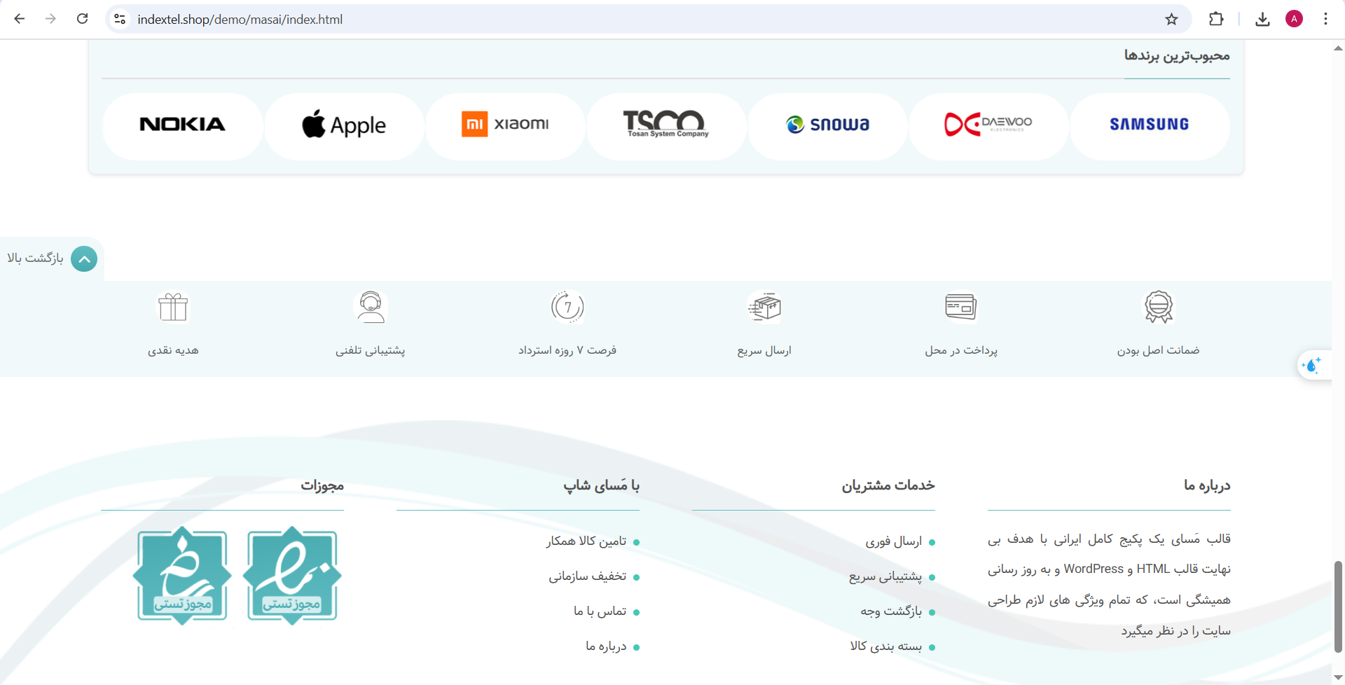 با استفاده از قالب مَسای شاپ، به راحتی میتوانید یک فروشگاه اینترنتی با طراحی کاربرپسند و شیک متناسب با سلیقه ایرانی راهاندازی کنید، در این قالب فروشگاهی HTML تمام نیازهای یک فروشگاه اینترنتی در نظر گرفته شده است،مَسای شاپ قالبی کاملا رسپانسیو با رابط کاربری حرفه ای و در عین حال ظاهر بسیار زیبایی دارد به نحوی یک کاربر بتواند به راحتی از آن استفاده کند.
