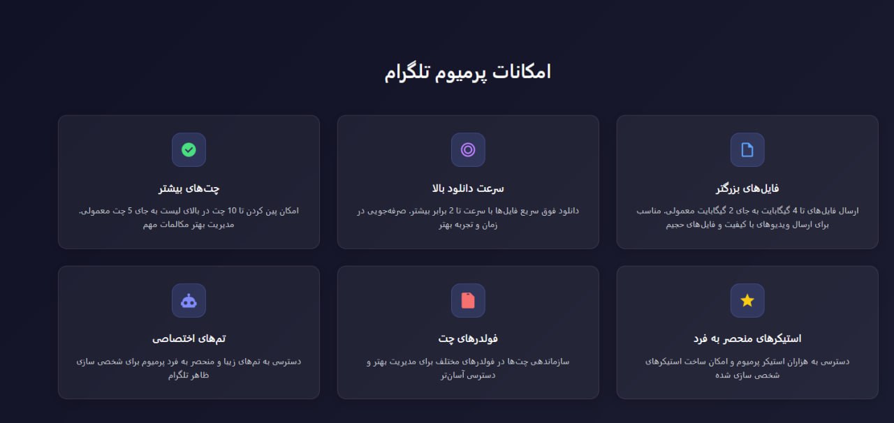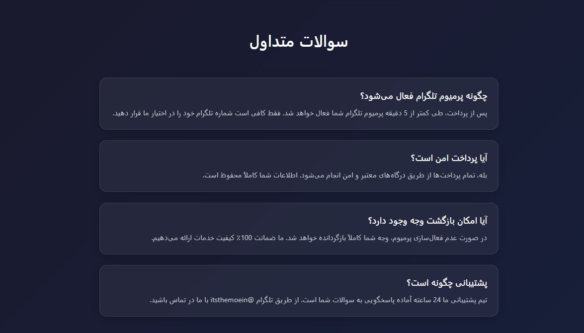 شامل بخش معرفی تمام امکانات پرمیوم تلگرام، سوالات متداول (FAQ) برای رفع ابهامات کاربران و اطلاعات پشتیبانی ۲۴/۷.