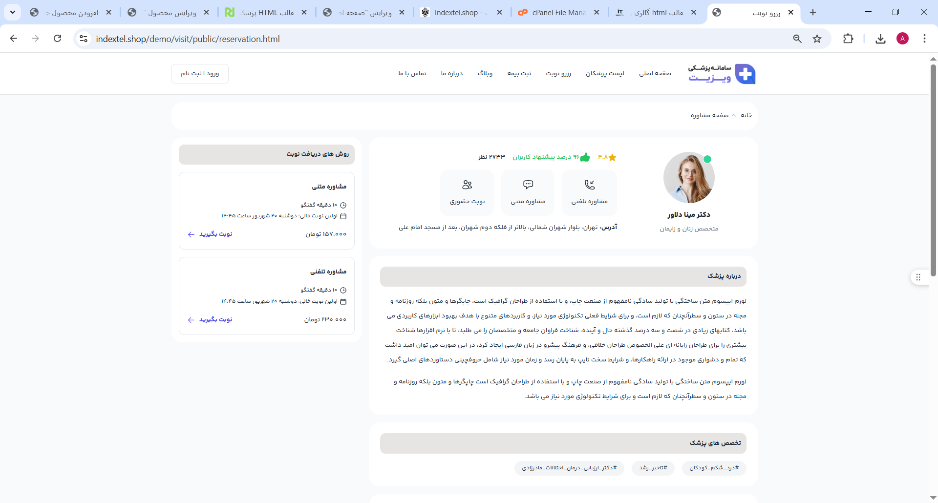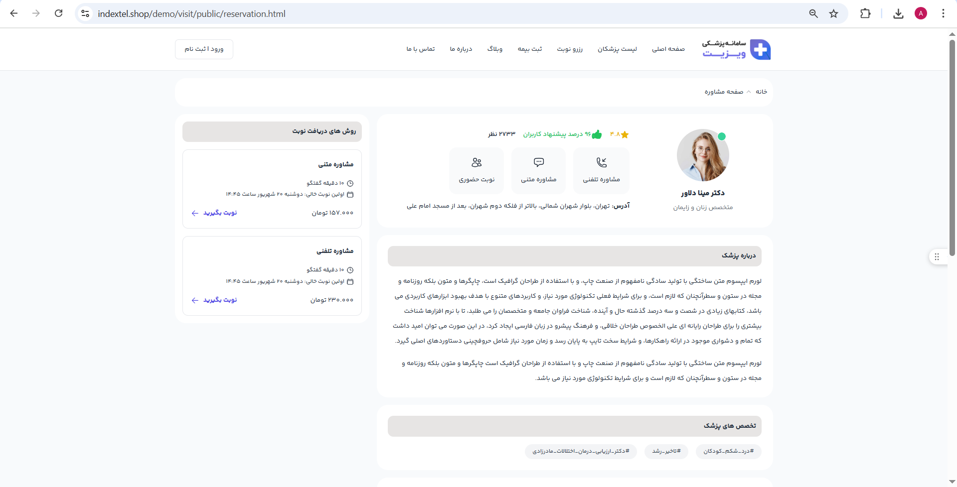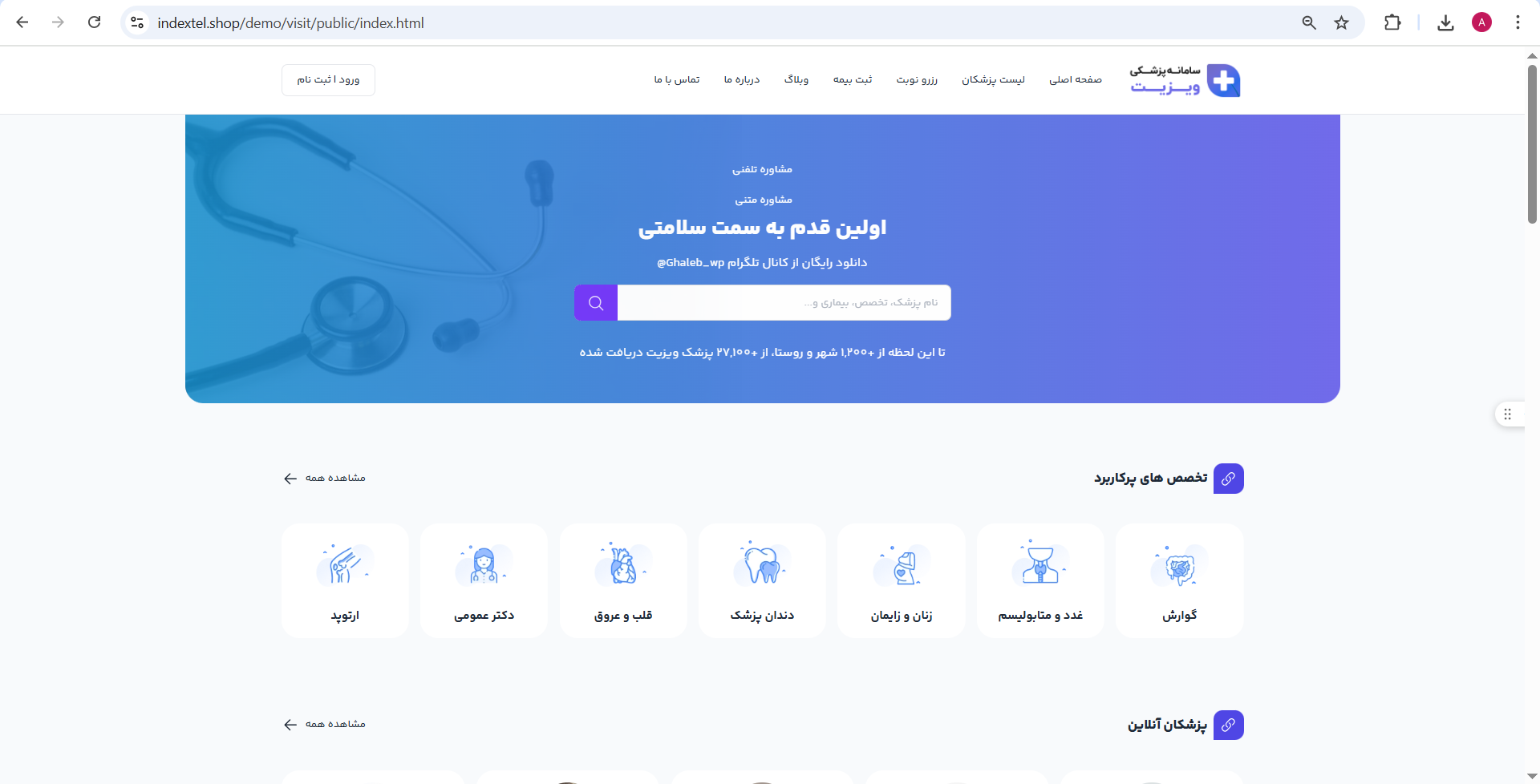 این قالب پزشکی و رزرو نوبت حدود 21 صفحه دارد که عبارتند از: